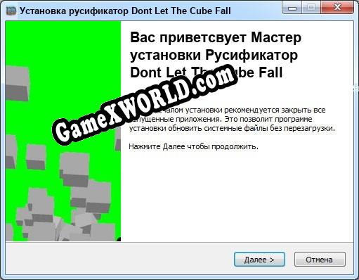 Добро пожаловать на GameXWorld.COM! На данной странице вы найдете актуальный и рабочий русификатор для игры Dont Let The Cube Fall. Используя русификатор к этой игре, вы сможете перевести игру на русский язык. Достуен русификатор от Red Hot, в ближайшее время мы постараемся добавить больше файлов для этой игры!