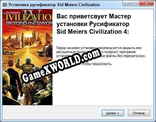 Добро пожаловать на GameXWorld.COM! Если вы зашли на эту страницу, вы скорее всего искали рабочий русификатор Sid Meiers Civilization 4: Beyond the Sword. Используя русификатор к этой игре, вы сможете перевести игру на русский язык. Достуен русификатор от rusifikatorMUSiC, в ближайшее время мы постараемся добавить больше файлов для этой игры!